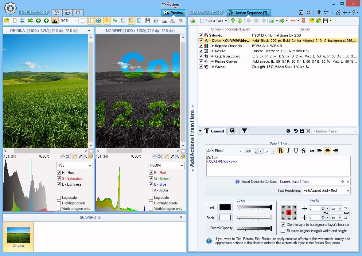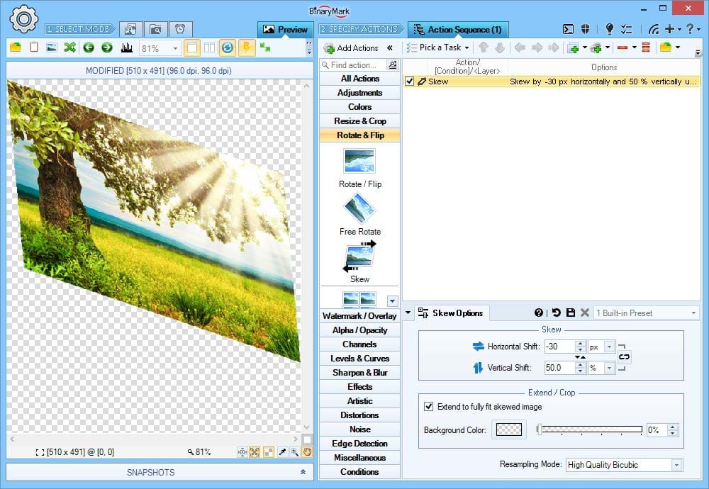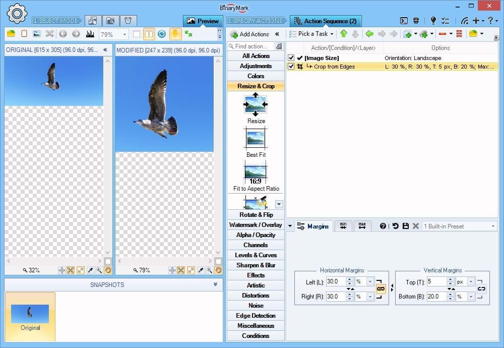 A typical usage scenario would be to first specify a sequence of actions to be performed and then save that sequence to a template file. Then you can easily process files entirely from command line using a few switches: input directory and input file pattern, path to a saved action sequence template file, and output directory with file naming pattern.