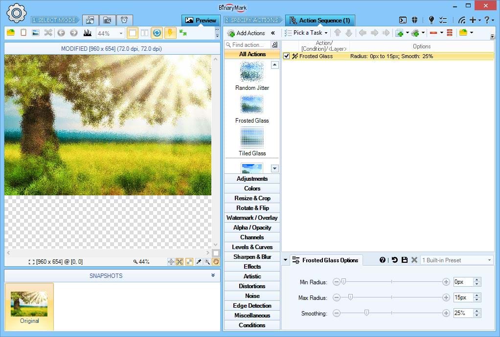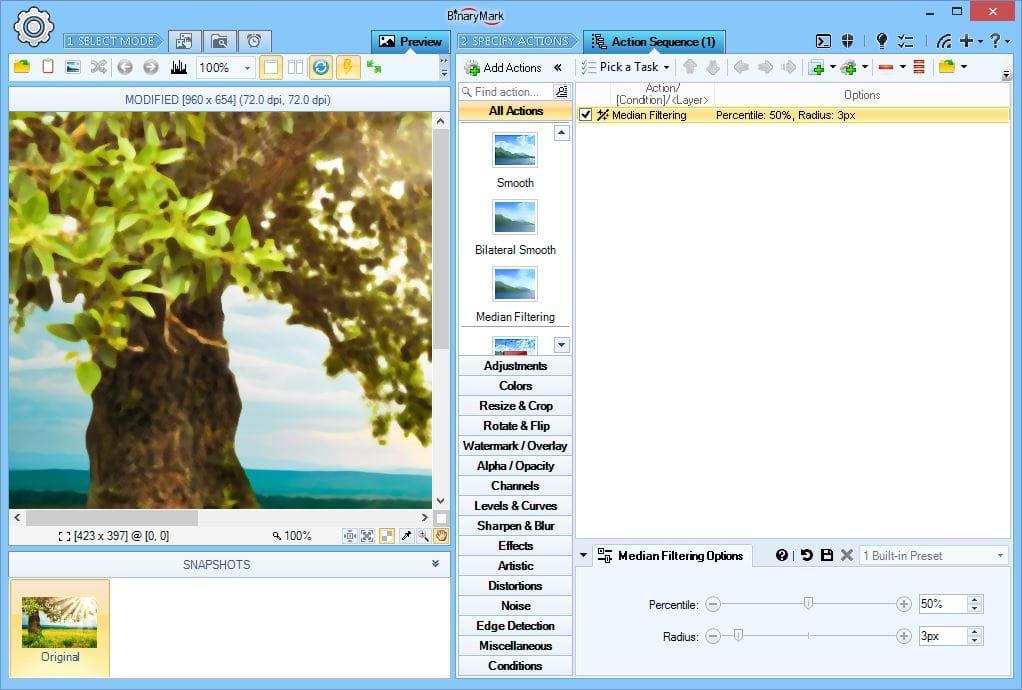 Batch Image Enhancer gives you full control when designing the sequence of actions; yet at the same time if you are just starting or want to perform some basic task quickly, the program offers numerous common tasks organized into categories that you can simply click on and see the needed actions be automatically added to the action sequence for you, so you can get started in no time!