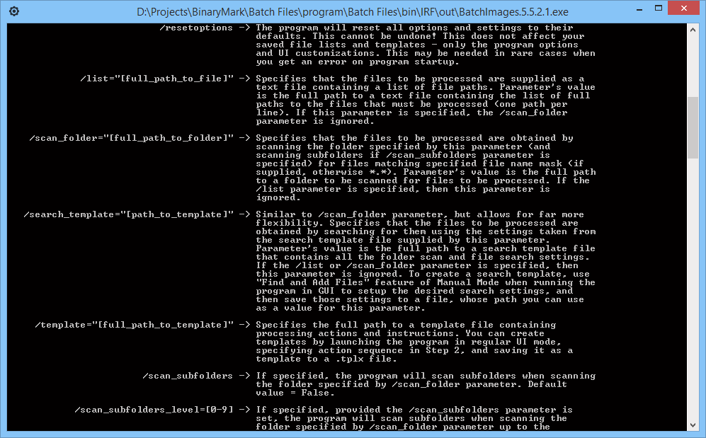 Batch Image Enhancer has full support for command line operation. It can not only be started from command line with specific options, but it can also run and operate entirely in console window.