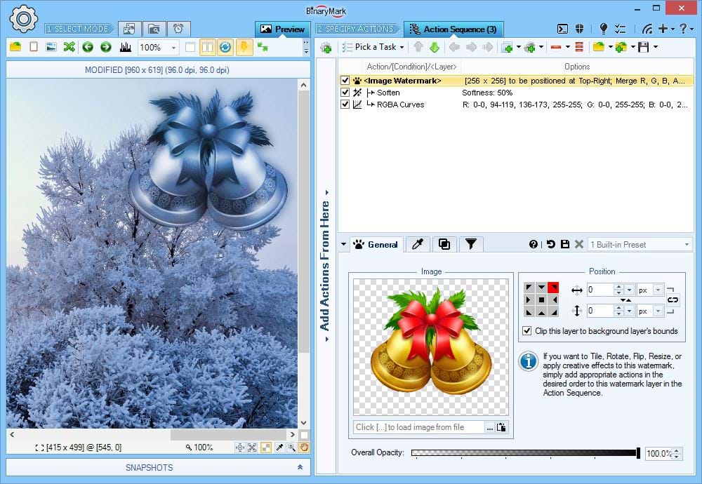 Before you process images you can preview either currently selected action or all actions in the action sequence on the preview image of your choice.