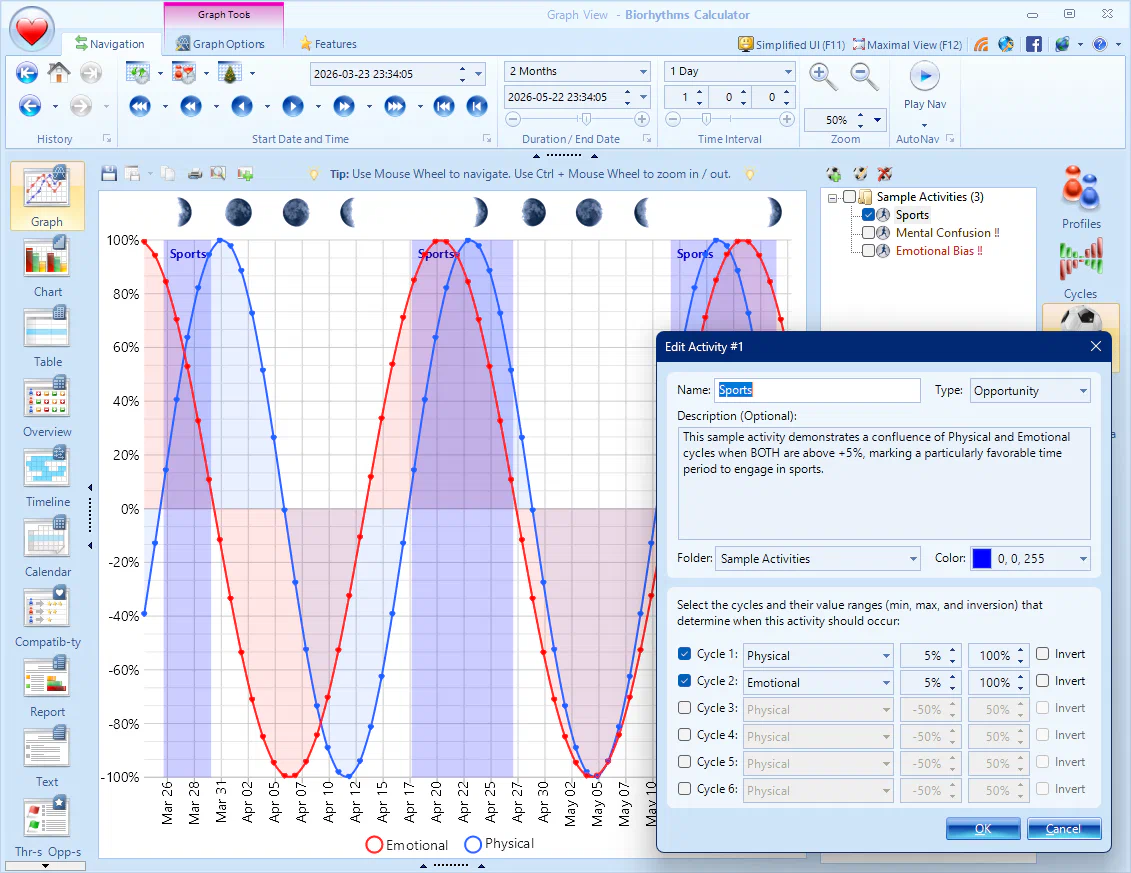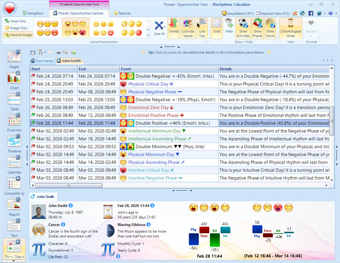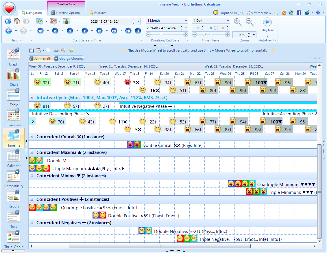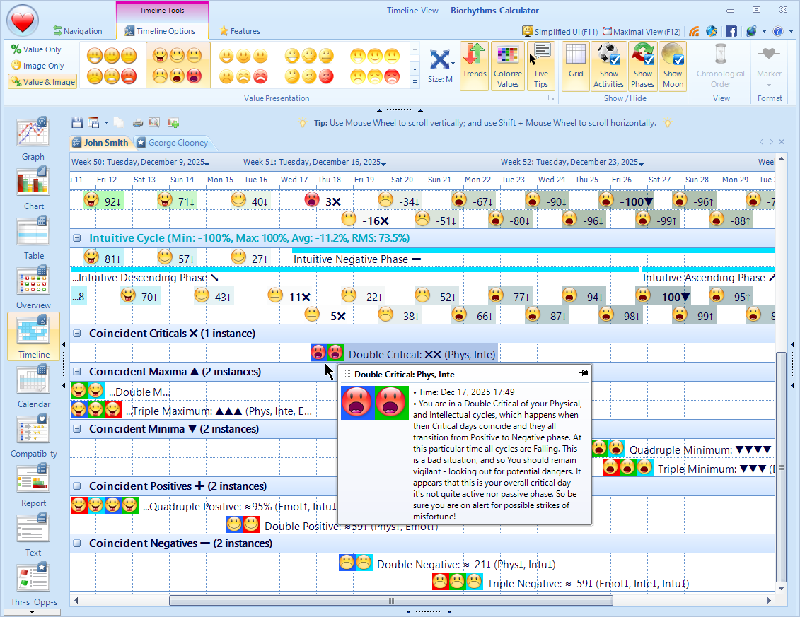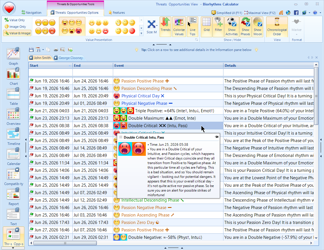 You can now see all times when 2, 3, or 4 biorhythm cycles meet or intersect, so you are alerted in advance when such rare events will occur. For example cycle coincidences like double-critical days or triple intersections will be shown in various views including Calendar, Timeline, Threats and Opportunities.