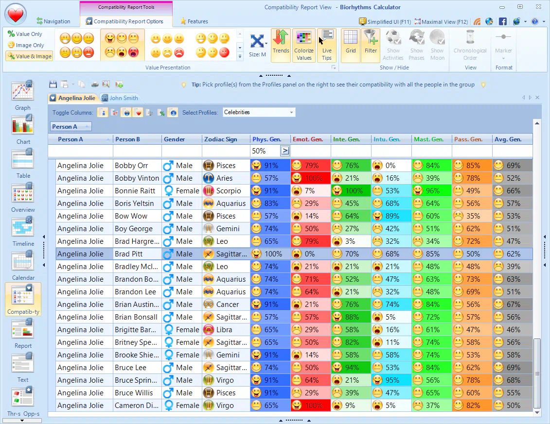 - NEWRow Filters let you quickly find profiles with desired biorhythm states. For instance, you can see only the profiles whose Physical biorhythm is above 50%.