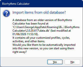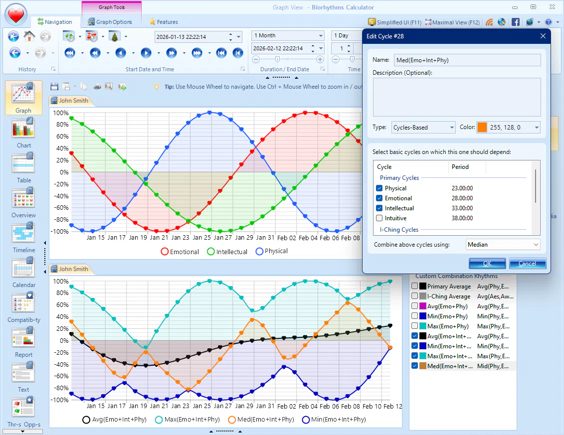 Biorhythms Calculator 2026 now supports new combination cycle types, extended periods of up to 9,999 days, and ability to display cycle phases in various views.