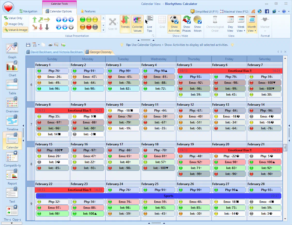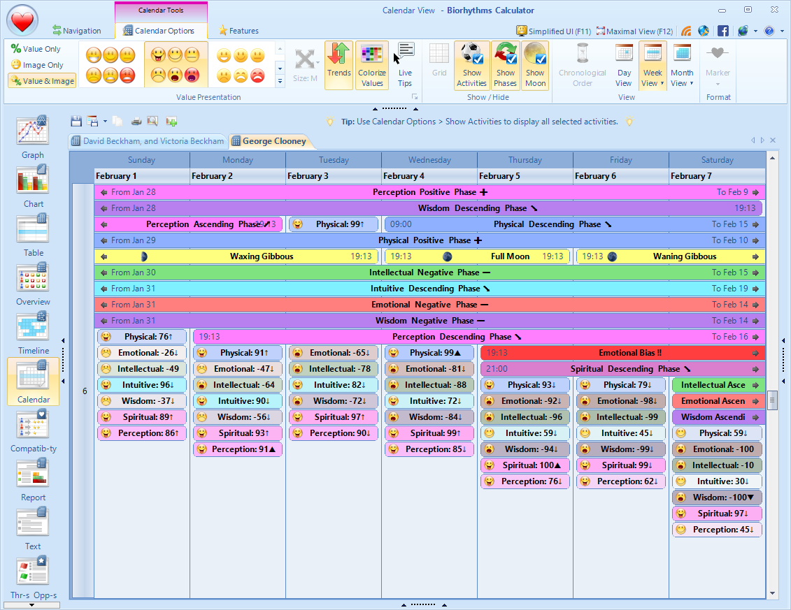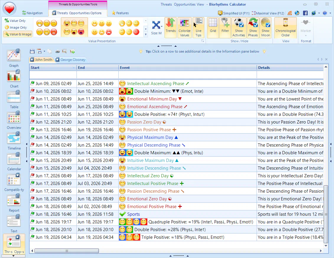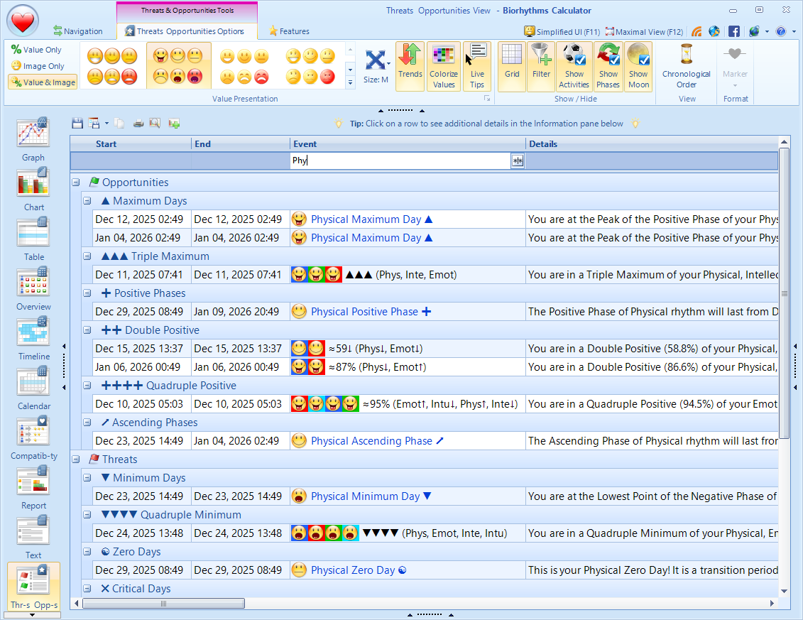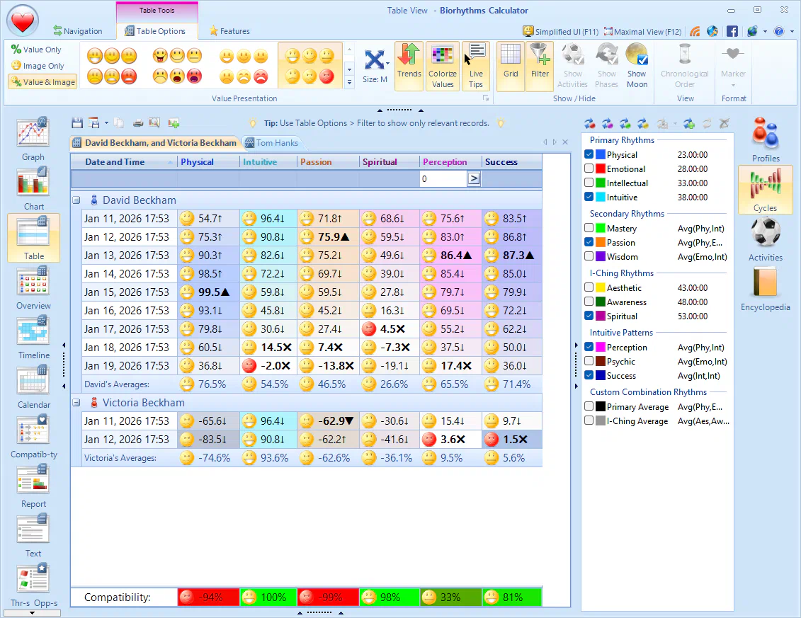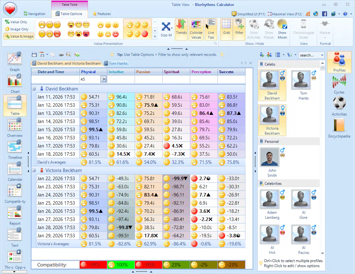 - NEWSorting and Filtering of rows is now supported in all Tabular views: Table, Compatibility, Overview, Threats and Opportunities, and Journal. So now you can quickly find times or profiles with desired biorhythm states.