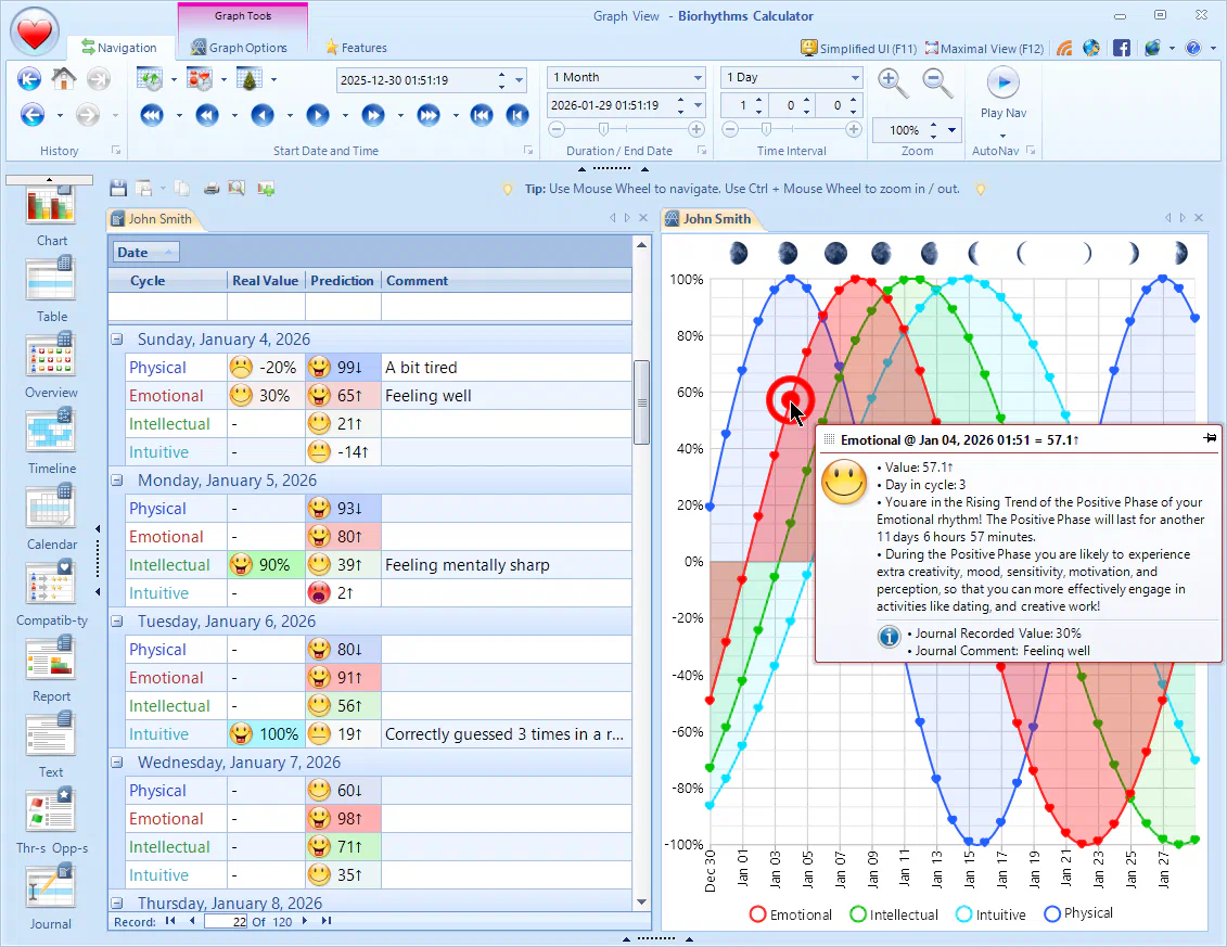 - NEWInteractive Crosshair lets you see the precise date, time, and value of any point on the biorhythm curve, and the Info Pane updates automatically to reflect the data point you're hovering over.