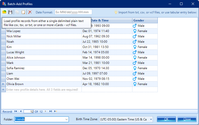 - NEWBatch-Import Profiles: You can bulk‑import multiple people and add many profiles at once from various sources like Excel or CSV files, or from VCF vCards. A user‑friendly grid interface allows you to preview and edit data before saving it in the program.