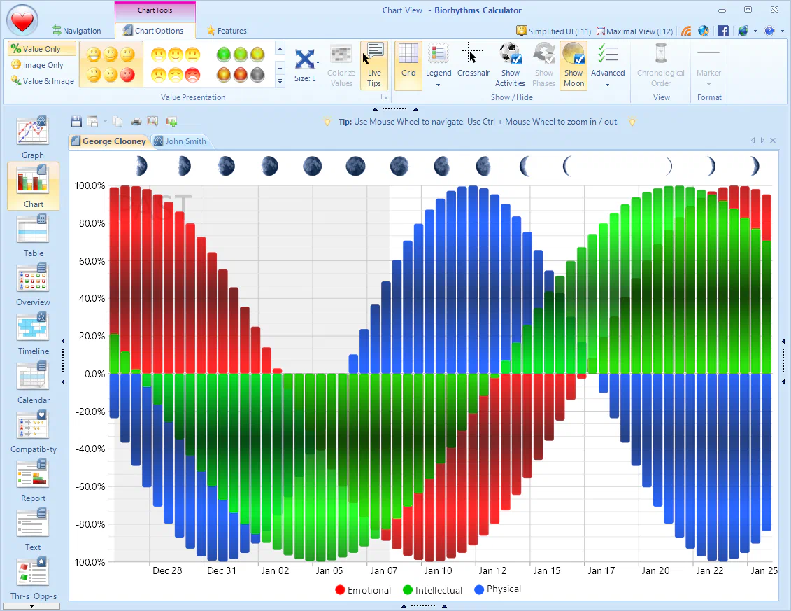 - NEWLunar Phases can now be displayed at the top of biorhythm charts, which is helpful for understanding how the moon may affect your biorhythms.